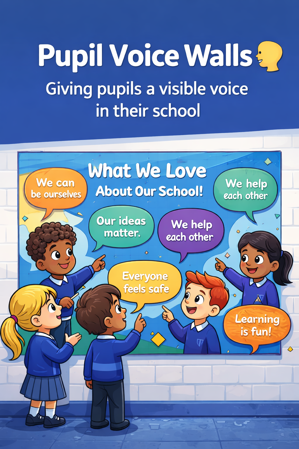 - Students, teachers, parents, and community members should be involved in the design process to ensure that the visuals represent the diversity of the school community.