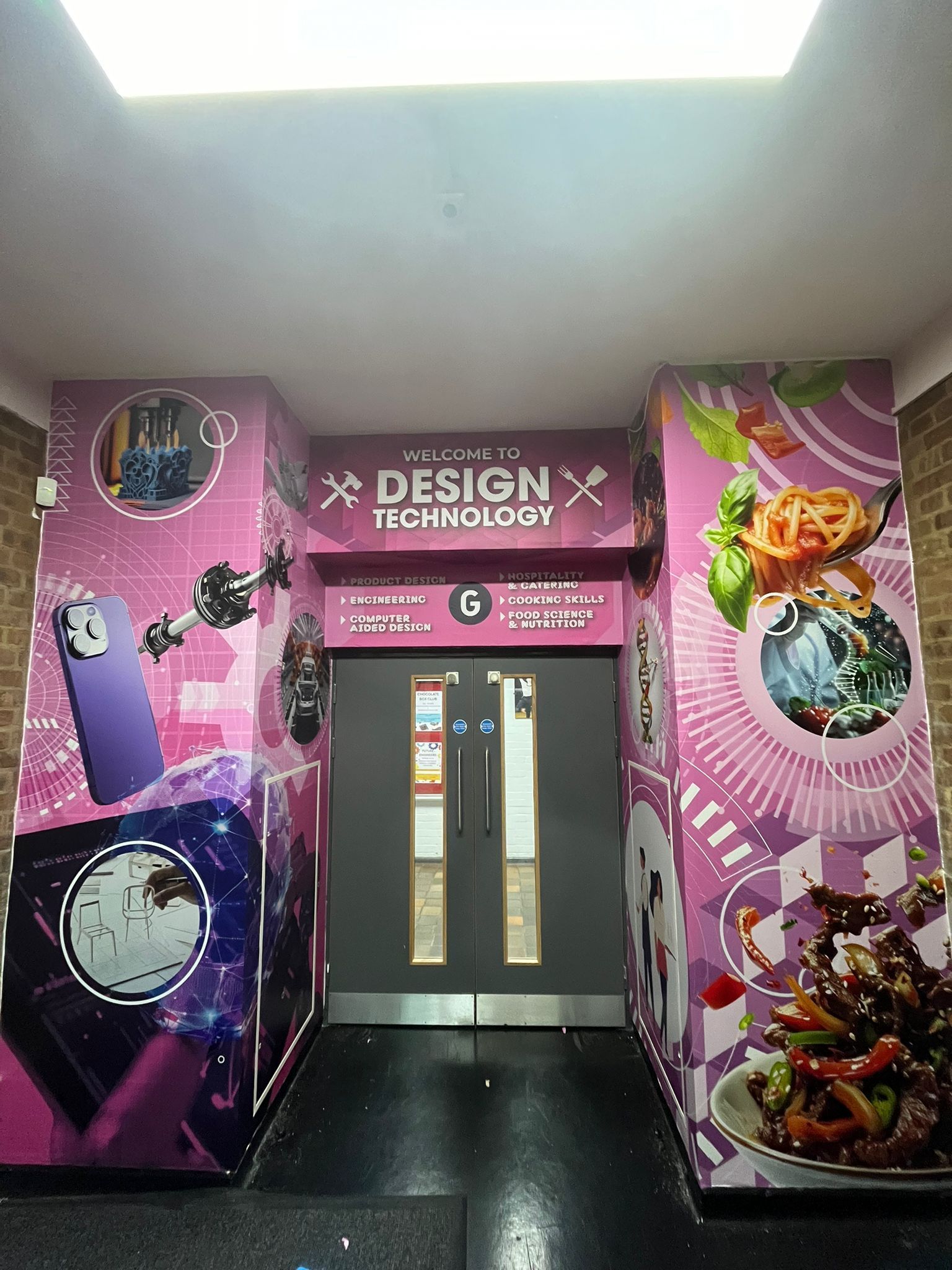 - The entrance to the Design Technology area showcases lively visuals depicting engineering tools and culinary arts intertwined with design elements. Its striking colour scheme and graphics effectively communicate the tactile essence of design technology across a spectrum of fields, from computer-assisted design to creativity. The entrance encompasses the diverse scope of this subject matter.