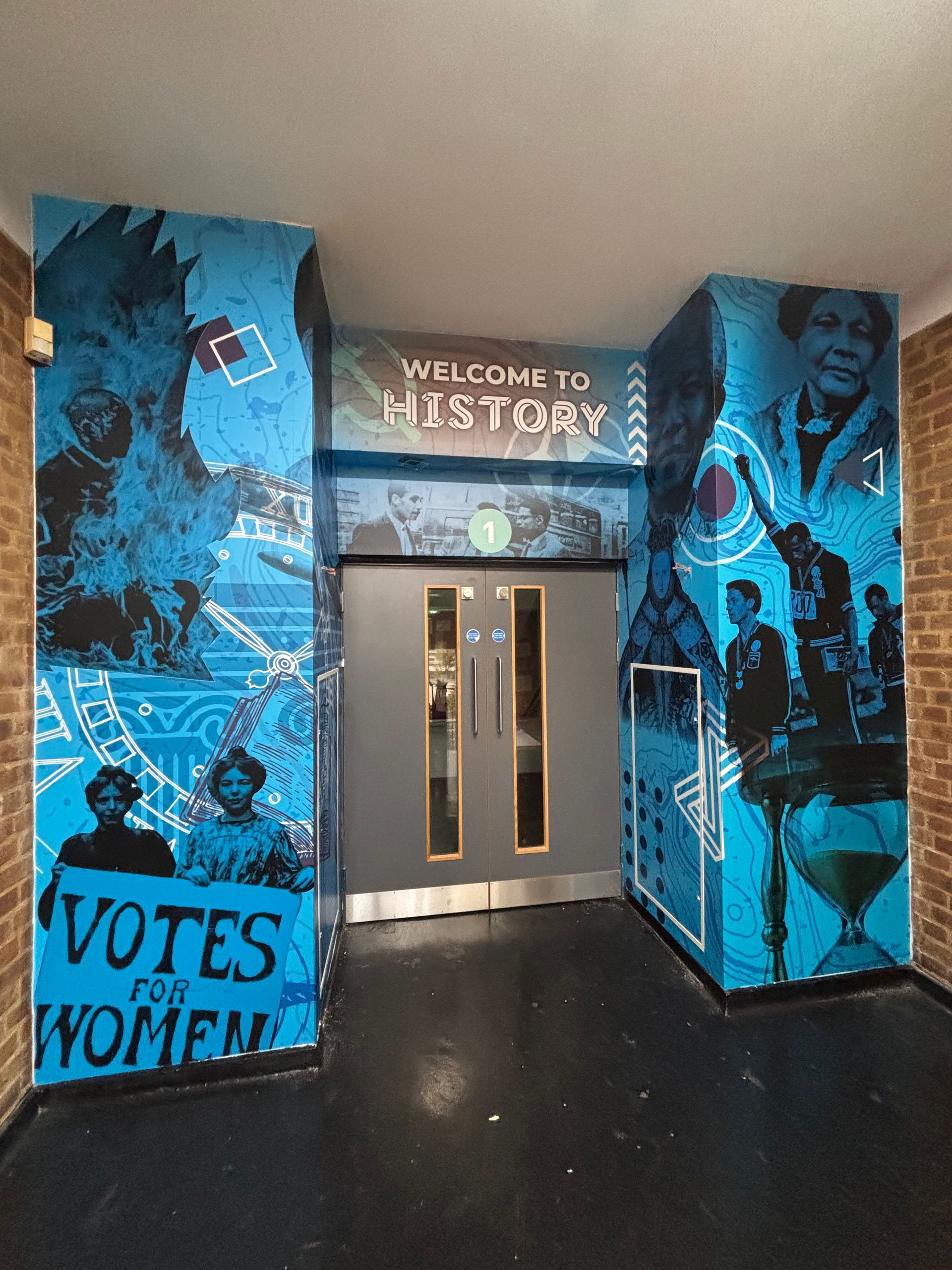 - The entrance to the History department is decorated with pictures depicting events like "Votes for Women " and portraits of historical figures. This design aims to emphasise the significance of learning from the past and how it shapes our reality—a nudge for students to explore history with depth and reflection in mind.