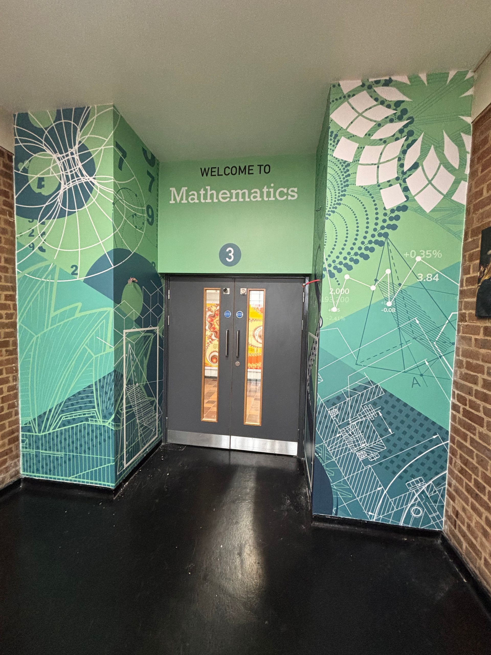 - The entrance showcases designs and mathematical symbols in shades of green that convey a feeling of organisation and accuracy, which reflect the methodical aspects of mathematics as a discipline. The design aims to make the subject more accessible by presenting it in a way that is