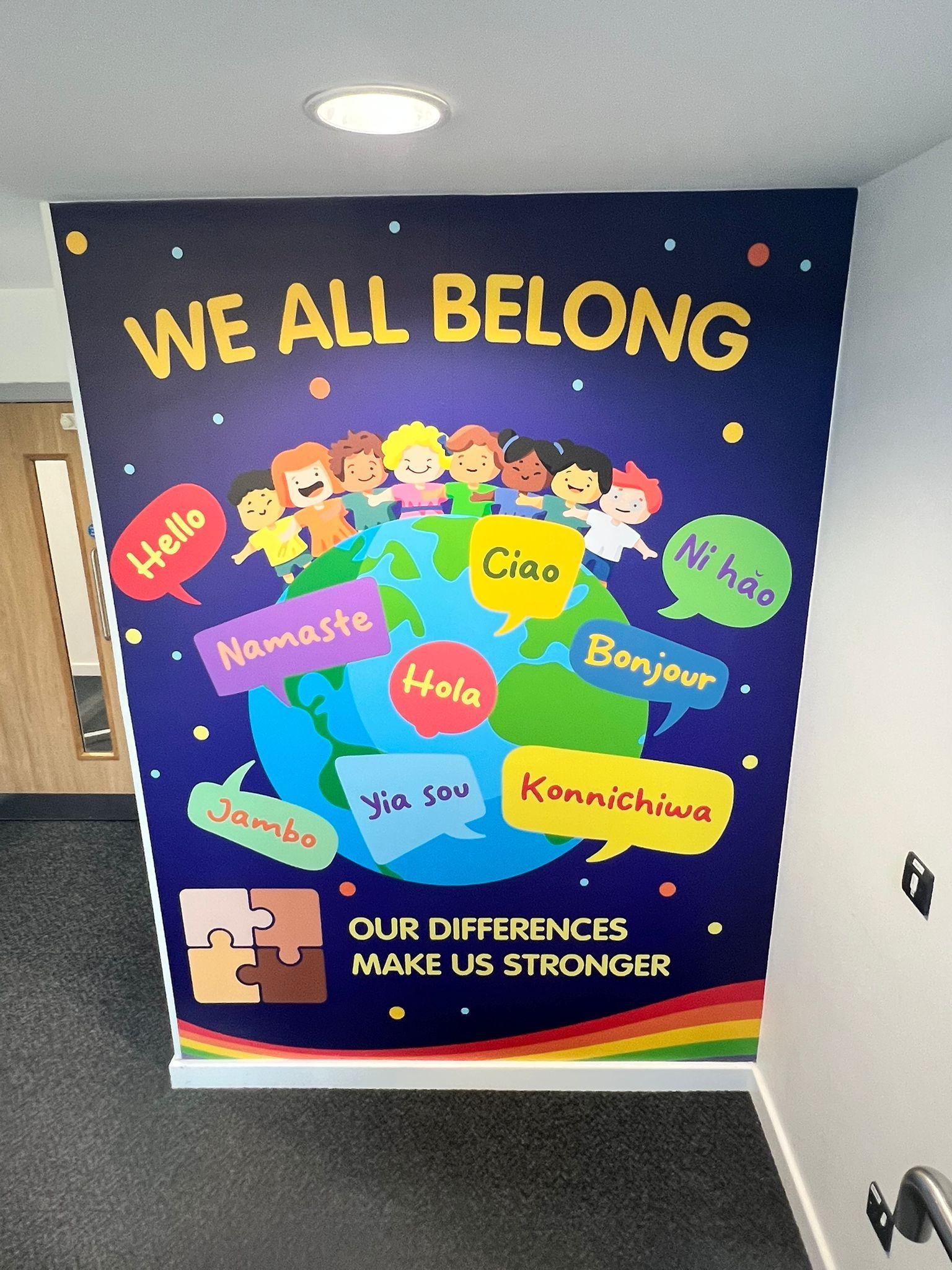 - The "We All Belong" mural presents a happy atmosphere which promotes friendship and inclusiveness for all. The mural features children from around the world who share greetings in various languages, surrounding a globe that symbolises unity and kindness.