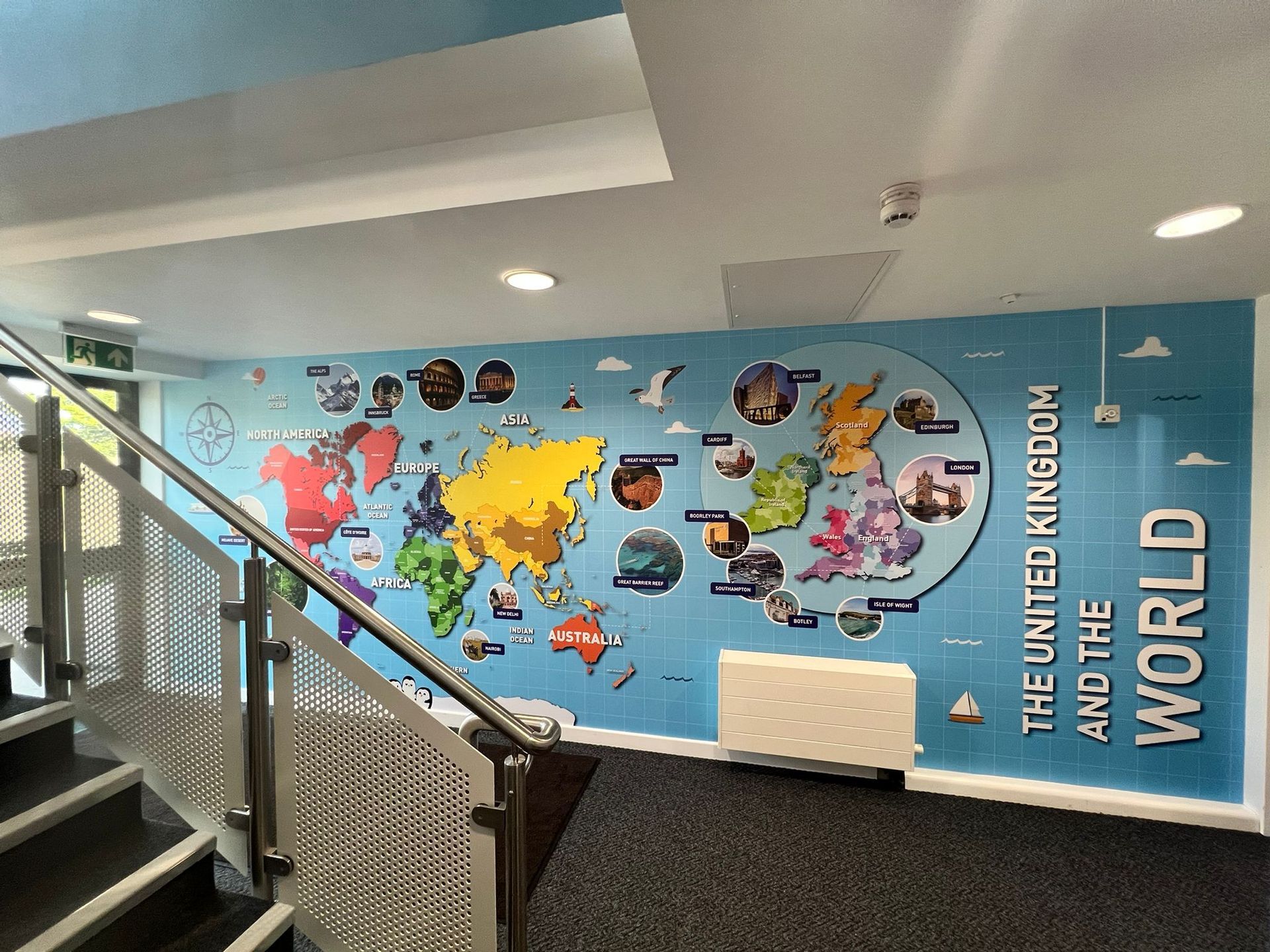 - The entire wall features a large world map, helping students understand the United Kingdom's position in the global context.