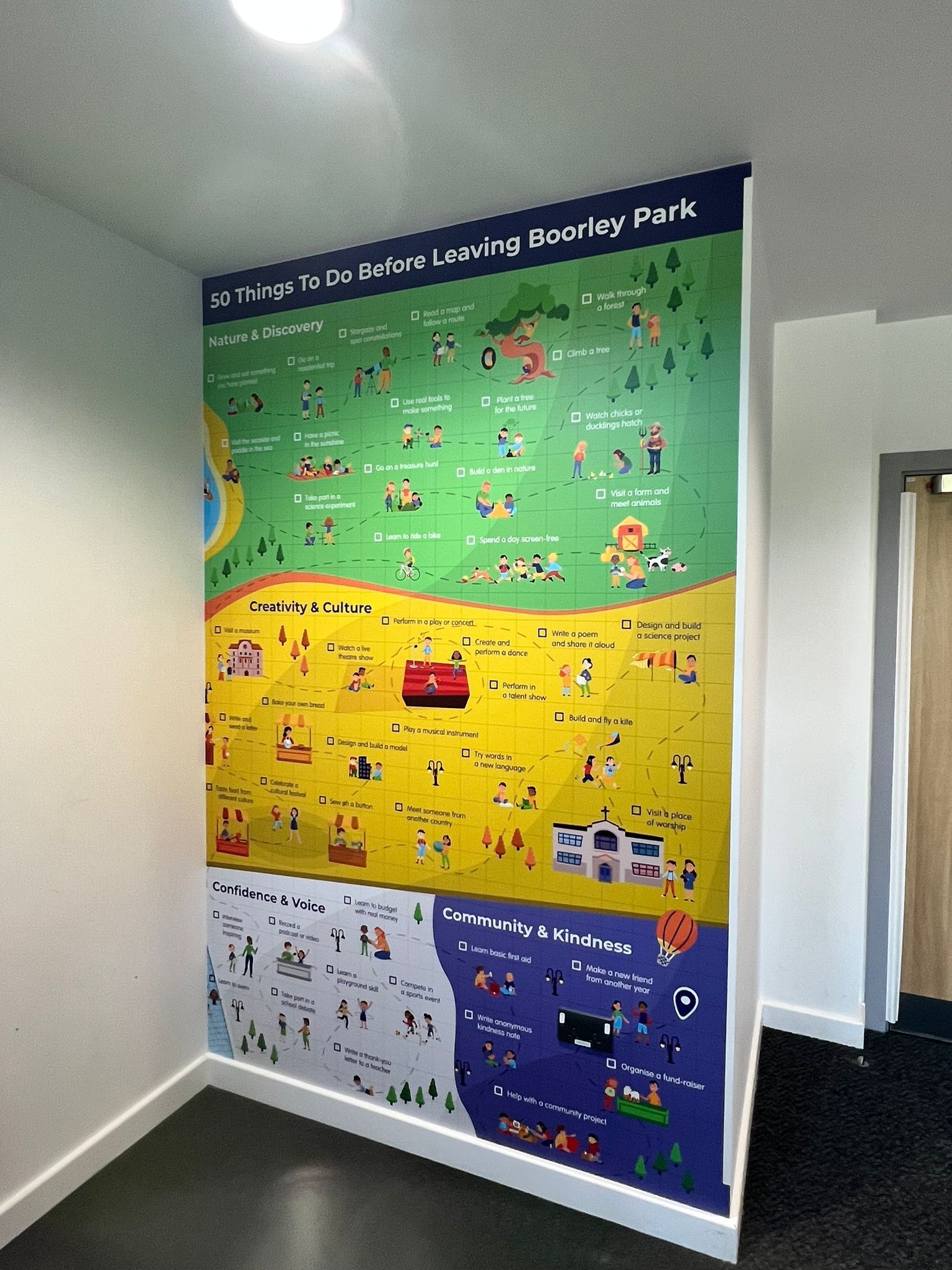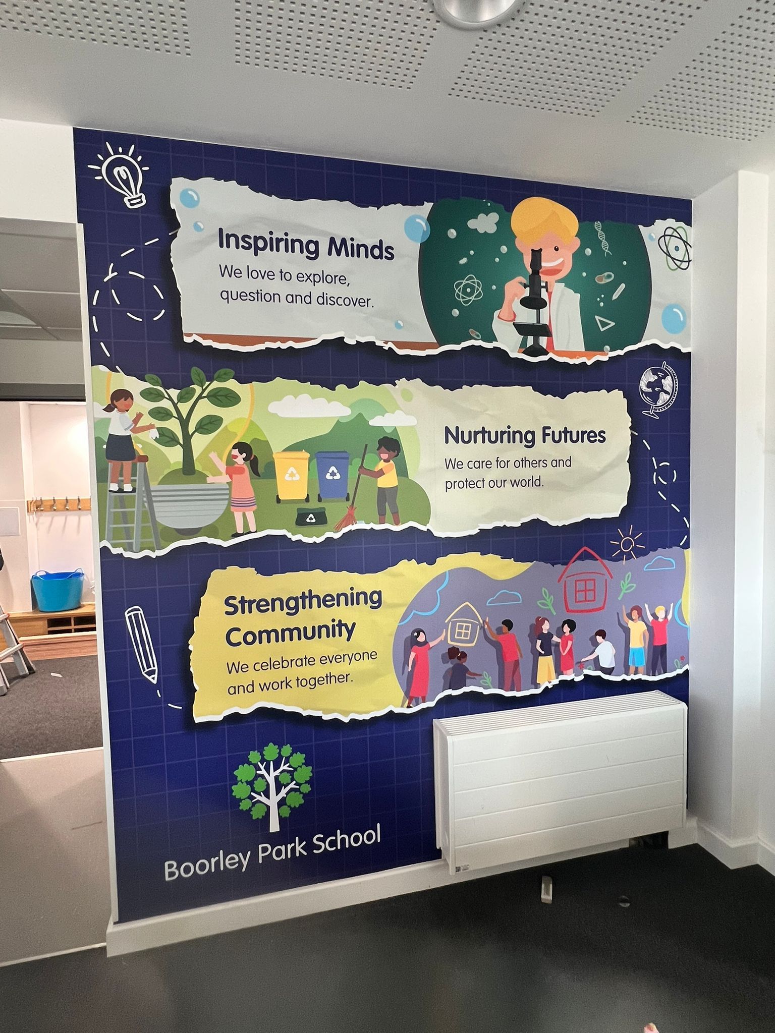 The walls of Boorley Park School now display multiple custom-designed wall graphics, which have transformed its corridors and shared areas into vibrant spaces.