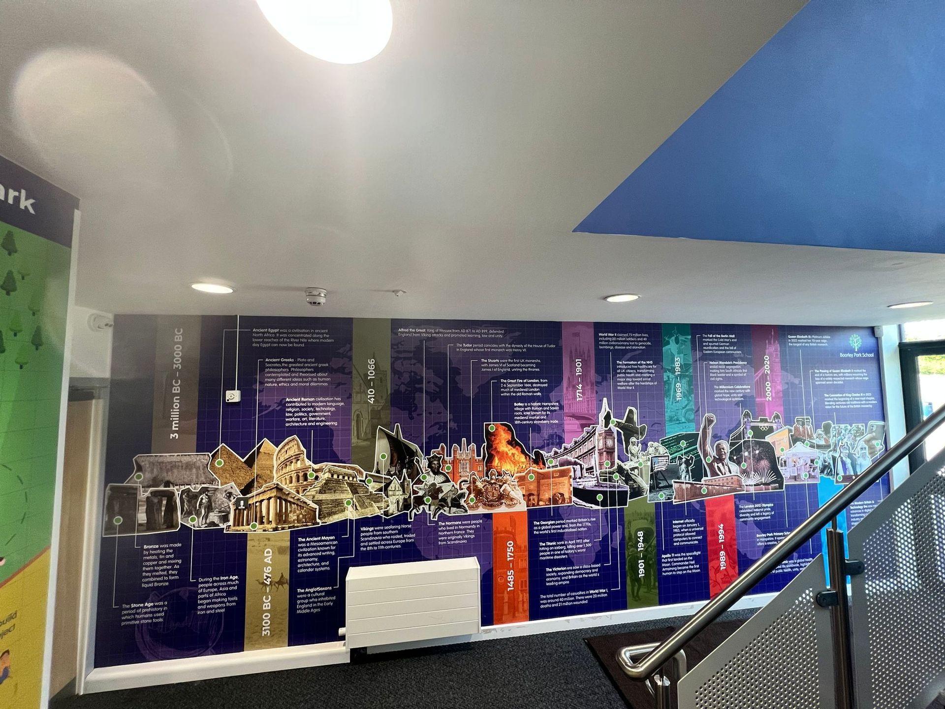 - The school environment has undergone a complete transformation because of these new wall graphics. The school corridors now serve as daily educational resources, featuring world maps and timelines, as well as content on creativity and kindness.
