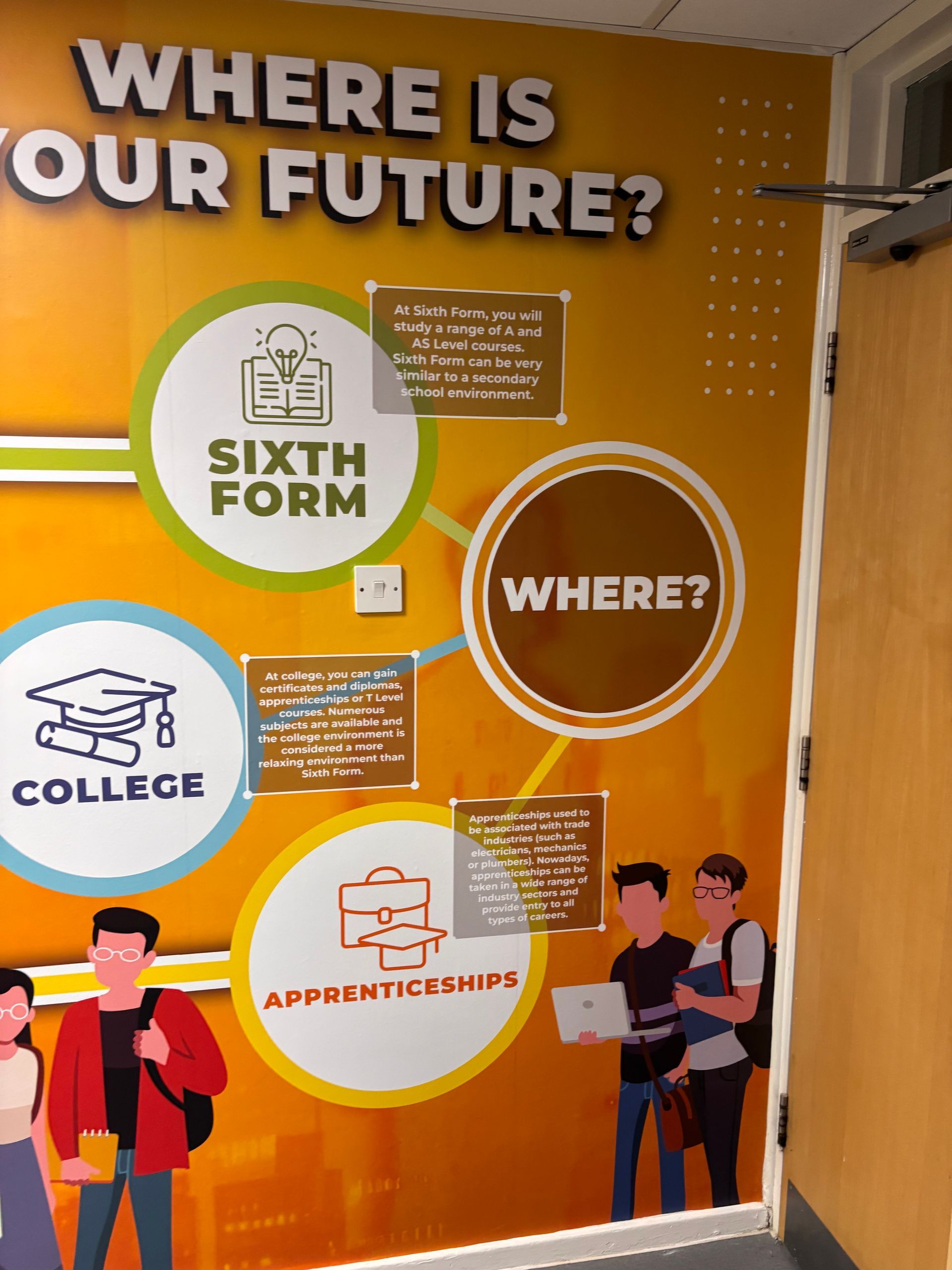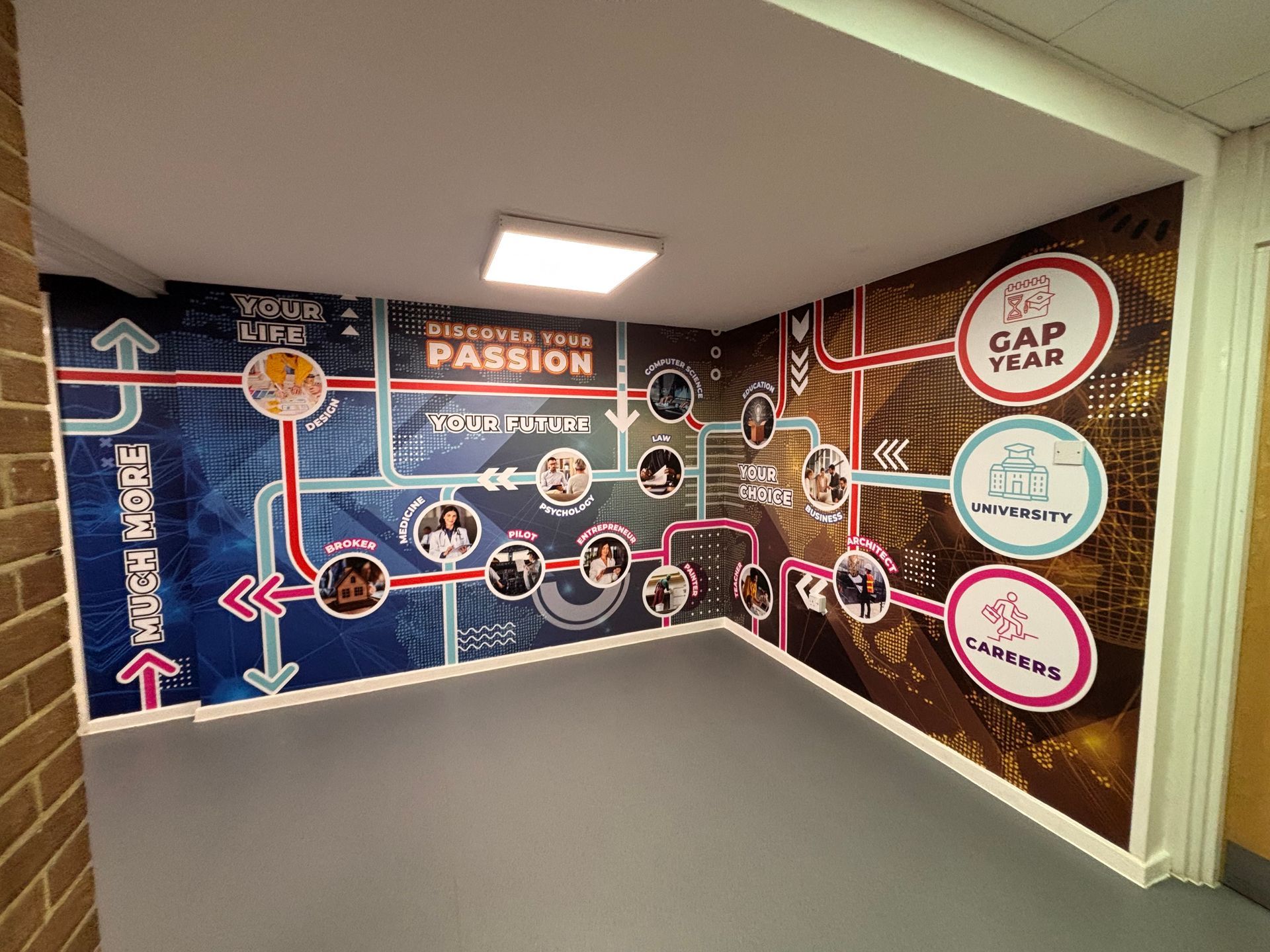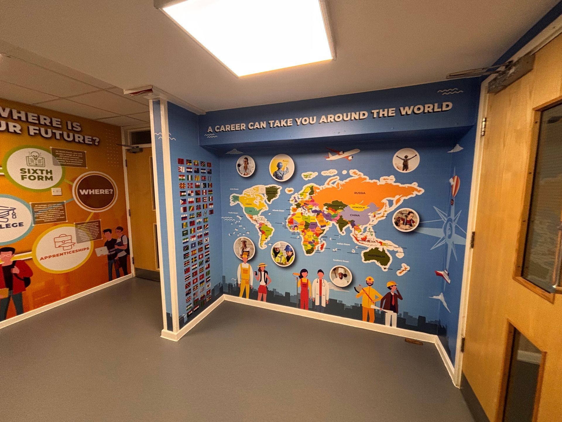 Forest Hall School's wall designs have effectively transformed the career guidance section into a motivating area that inspires students to enthusiastically consider their future and purposefully envision their professional paths ahead. The graphics highlight career options and worldwide possibilities. This initiative showcases the school's dedication to helping students make well-informed choices about their future while fostering an exciting and interactive atmosphere for learning.