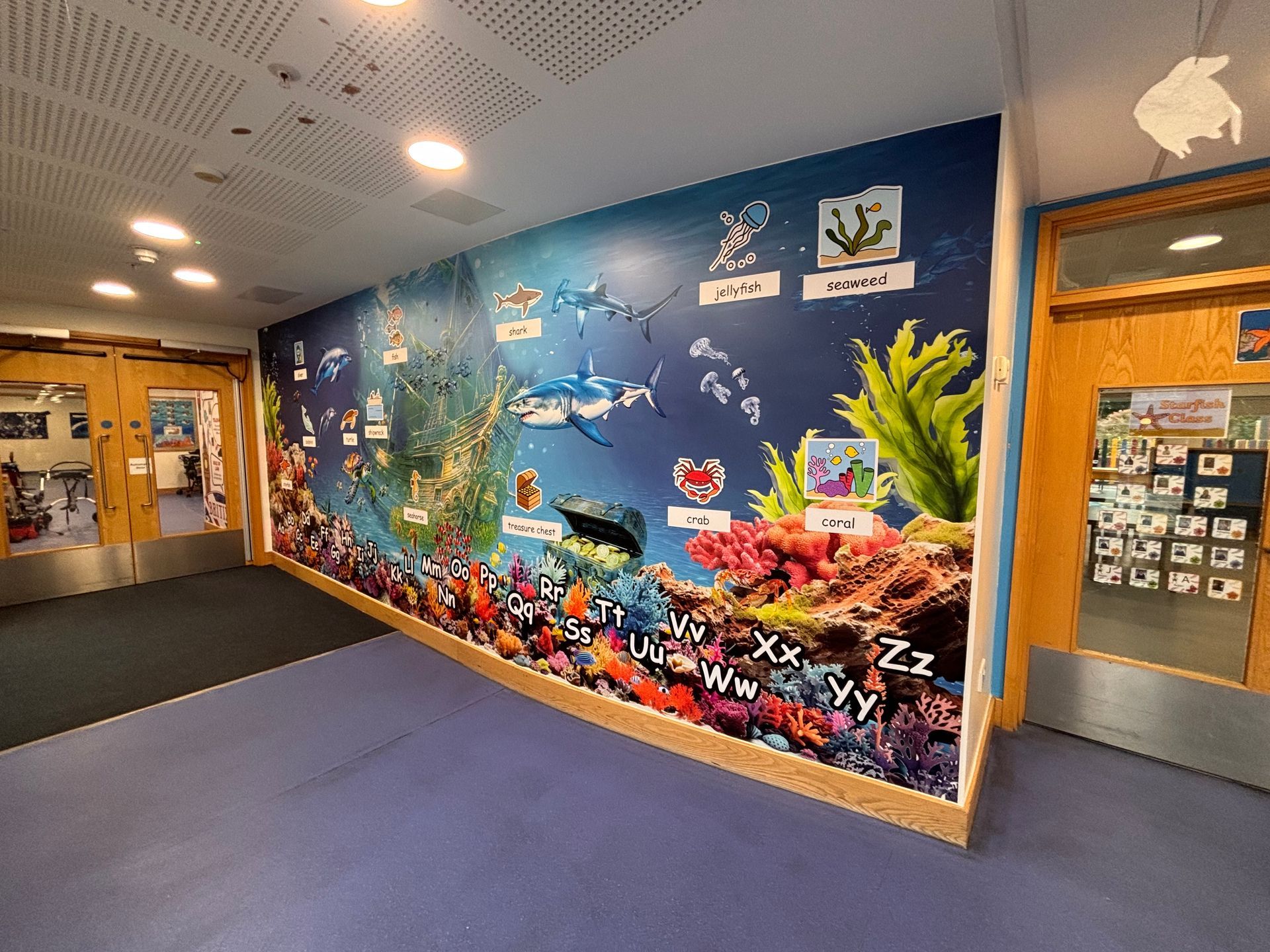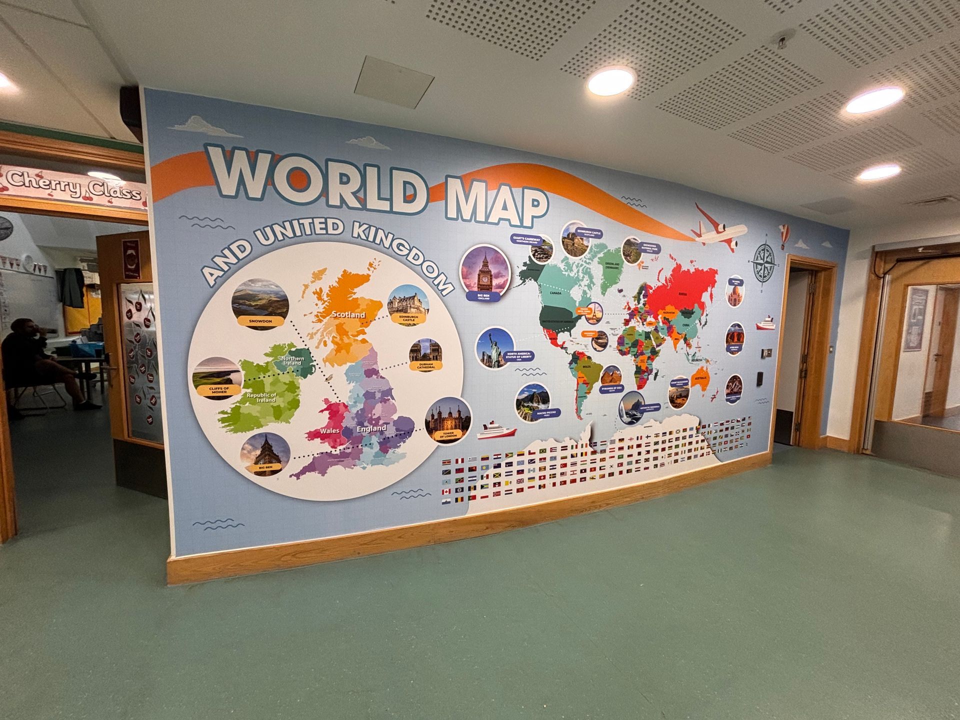 A Closer Look into Boorley Park School The walls of Boorley Park School now display multiple custom-designed wall graphics, which have transformed its corridors and shared areas into vibrant spaces. The educational environment at the school features wall graphics that display learning content, discovery elements, and belonging messages to create daily inspirational spaces for students. The World of Imagination and Learning Creation: The wall features portraits of inspirational thinkers, writers, and creatives alongside their most famous quotes to demonstrate the power of imagination and lifelong learning. The design unites contemporary illustrations with educational elements to transform the area into a celebration of creative expression and reading skills. Educational Influence: The artwork motivates students to explore language and artistic and cultural subjects. The artwork motivates students to understand how their imagination leads to progress through their willingness to take risks and show curiosity. Teachers now use this display to lead classroom discussions about storytelling, creative expression, and student resilience. The Geography of Connection Creation: The entire wall features a large world map, helping students understand the United Kingdom's position in the global context. The continents contain essential landmarks and images that establish connections between classroom geography education and actual exploration.  Educational Influence: The colourful map transforms the stairwell into an interactive learning area for students. Students use the map to explore global geography by finding cities and following routes, while understanding how different places and cultures connect.