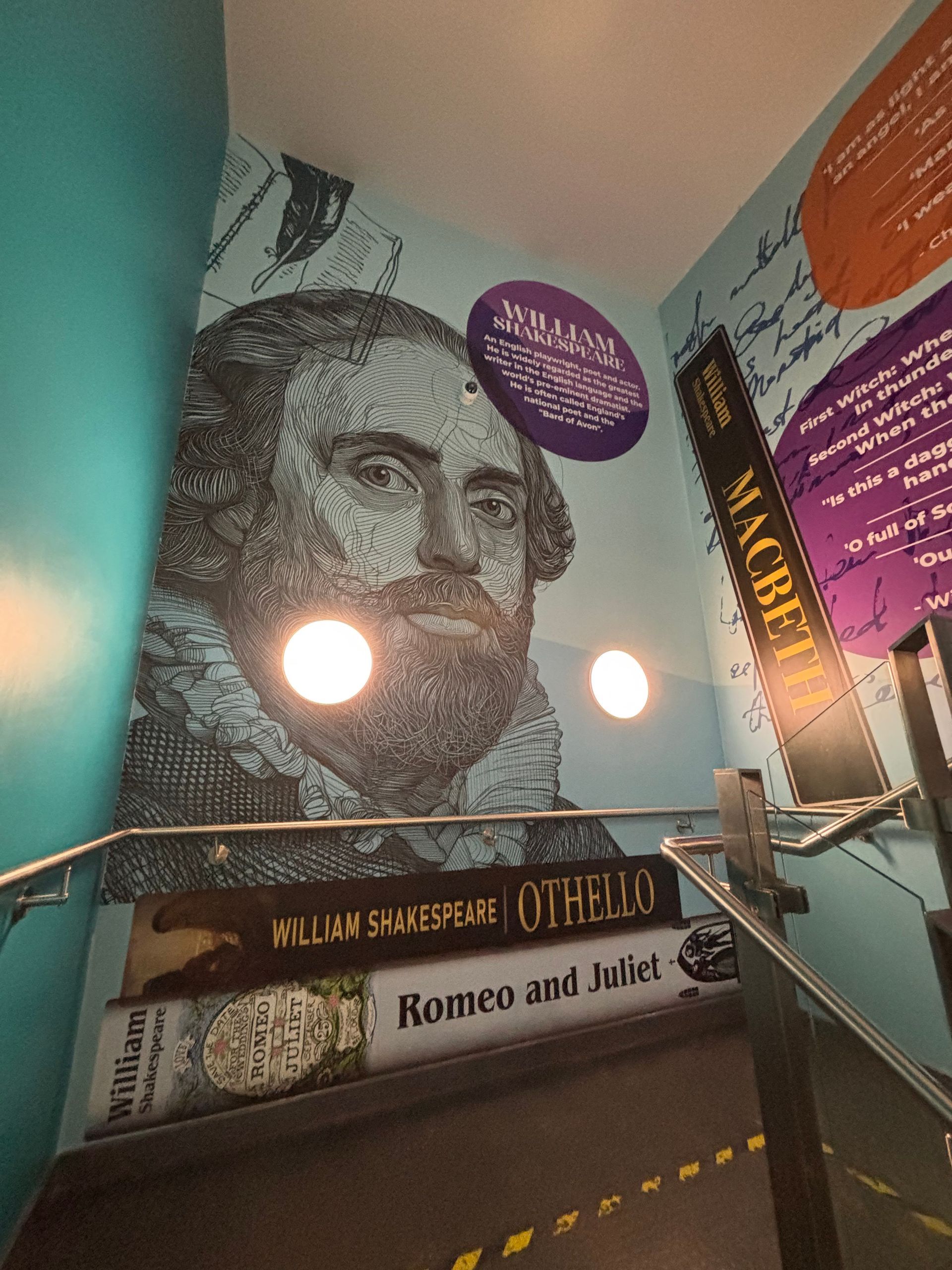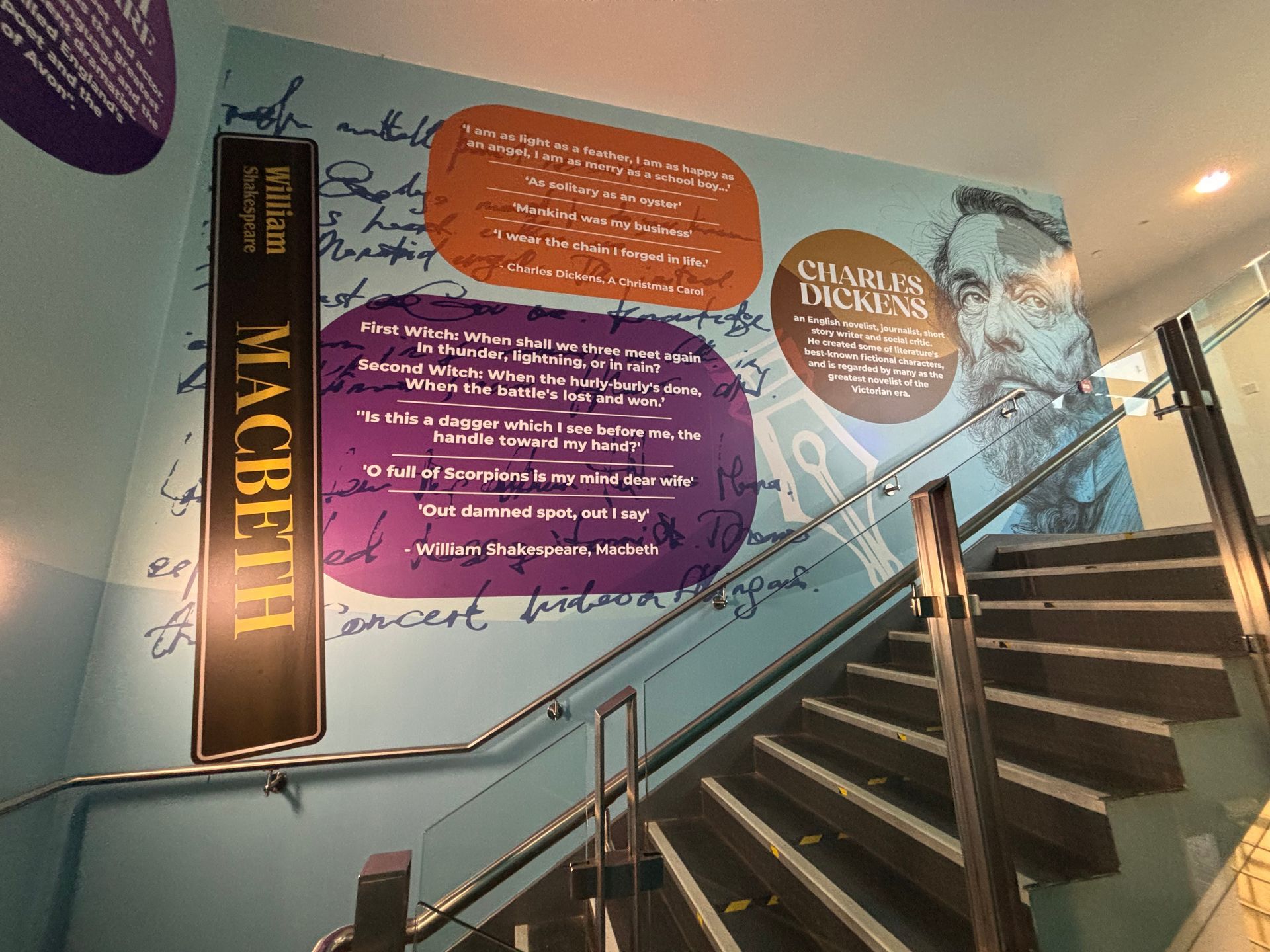 - The stairwell's walls are decorated with paintings by William Shakespeare and Charles Dickens, figures from English literature. These artworks feature quotes and reflections on each author's impact. They remind students of the works they are studying and aim to make these classic texts more engaging. This display is intended to pique students' interest in literature and foster a connection with enduring stories and characters.