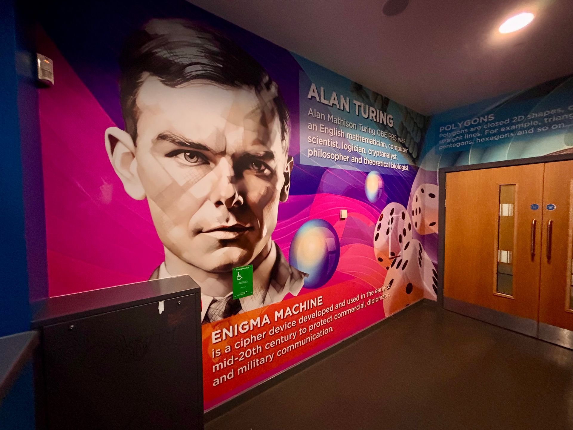 - The section honouring Alan Turing serves as a tribute to his advancements in math and computer science and his impact on cryptography while encouraging students to embrace creativity and strive to think through a depiction of Turing and details about his achievements like the Enigma machine. This space emphasises the value of resilience and resourcefulness, with its vibrant colours and unique background elements that draw students' attention as they walk by.