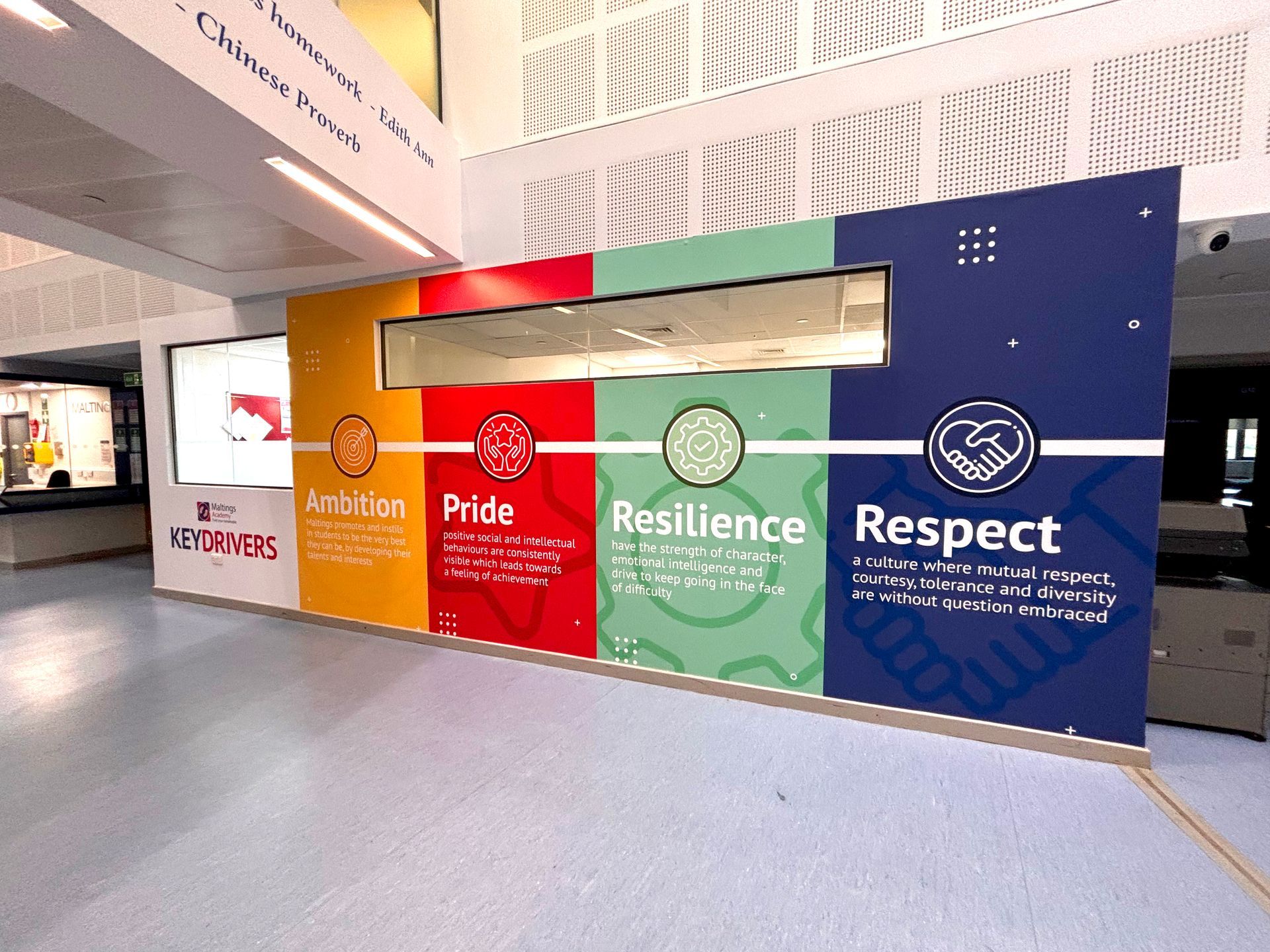 - School corridors. The short, easy-to-read value statements "We Are Kind", "We Aim High", and "We Keep Going" enable students to connect these values directly to their personal actions through reading about them.